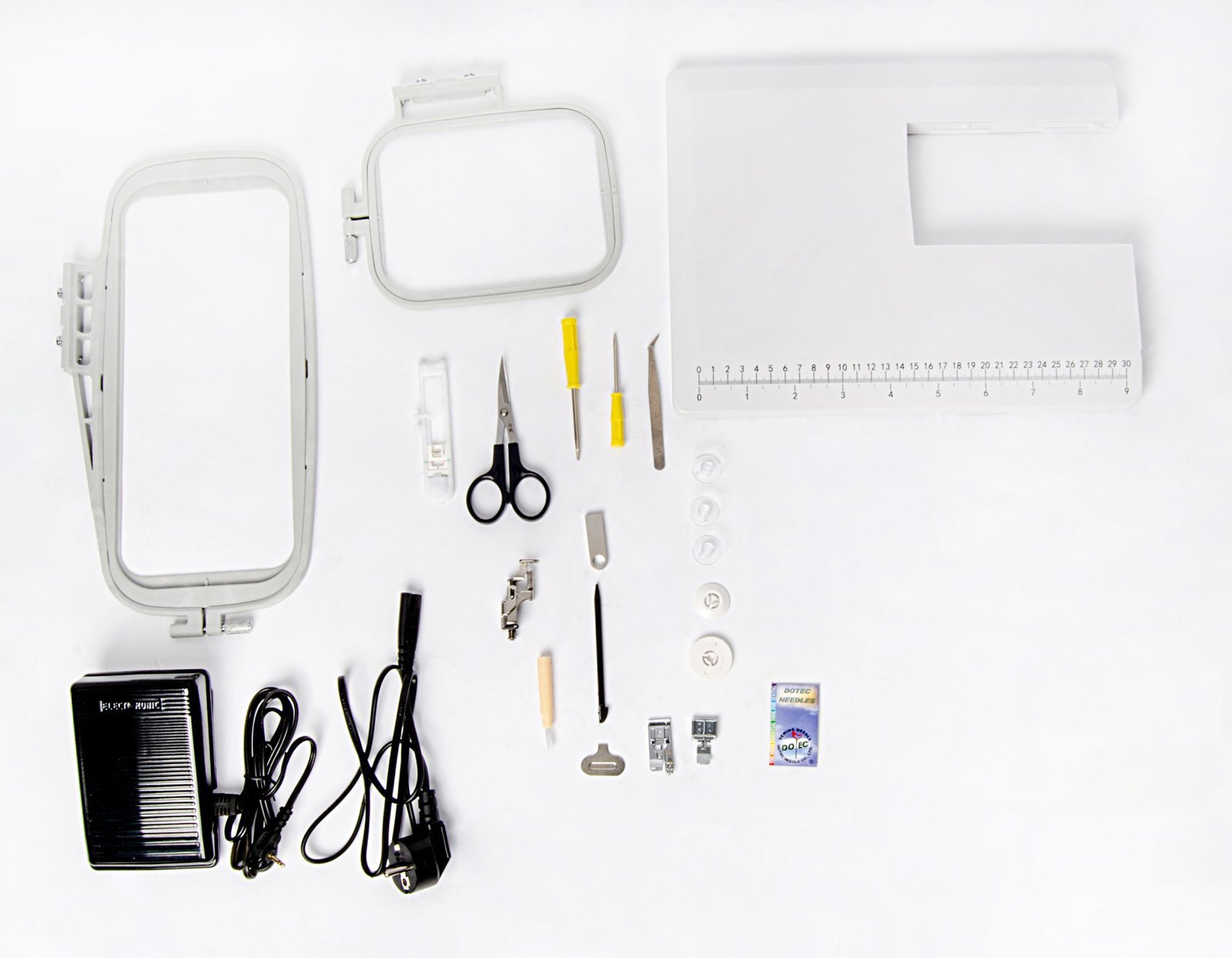 2 bastidores (tamanhos: 23,5x10cm e 10x10cm), Módulo para bordado, Mesa extensora para costura, Calcador para bordado, Calcador para casa de botão automática, Calcador dezigue zague/costura, Calcador para zíper, Calcador para pregar botão, Apoios para retrós, Abridor de casa/escova de limpeza, Chaves de fenda grande e pequena, Chave para chapa de agulha, Kit de agulhas, Bobinas, Pinça, Caneta touch, Tesoura, Tela para retrós, Pen Drive, Cabo de energia, Pedal eletrônico e Manual de instruções em português.